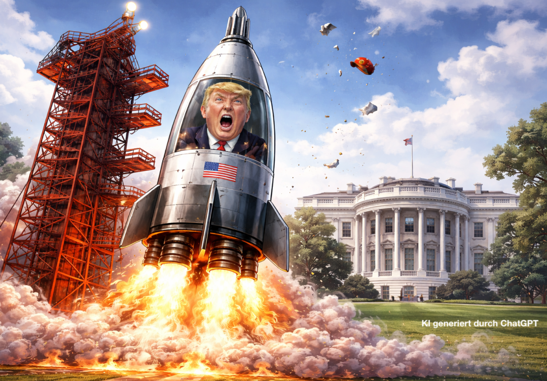Geradezu grotesk wirkt das News-Ticker-Laufband unter dem TV-Bild der Astronauten, wonach Trump dem Iran mit der „Auslöschung der Zivilisation“ droht, während sich 300.000 Kilometer von Washington entfernt vier Menschen schwerelos in die Arme fallen, weil sie nach getaner Arbeit in der Kapsel ein bisschen Spass haben wollten.