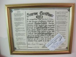 In unserem Gäste-Bad hing jahrelang eine Urkunde, die unsere Besucher regelmäßig schaudern ließ. Irgendwann nahm ich das gerahmte Dokument ab und hängte es in meinem Büro wieder auf. Jetzt ekelten sich die Gäste eben, wenn sie mich im Büro besuchten. Ehrlich gesagt habe ich lange Zeit nicht mehr daran gedacht, wie ich zu der Urkunde gekommen war. Aber vor ein paar Tagen hat mir eine tolle Kollegin aus Deutschland erzählt, dass sie für eine Gold-Reportage im Yukon gewesen sei. Von einem etwaigen Besuch in der „River Rat Bar“ von Dawson City hat sie jedoch nichts erwähnt. Das fand ich etwas schade. Deshalb soll die Story, die hinter der Urkunde steckt, hier noch einmal erzählt werden.