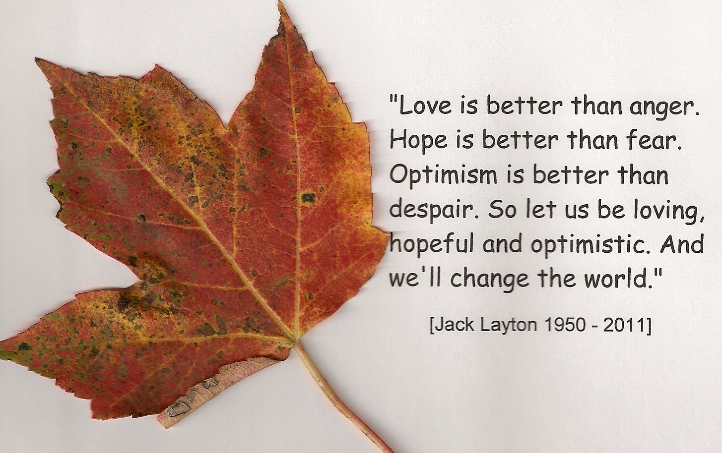 Eben habe ich das erste Herbstblatt im Wald vor unserem Haus gefunden. Es ist noch etwas blässlich in der Rötung. Aber der Indian Summer kommt noch früh genug. Für mich ist dieses Ahornblatt ein Symbol der Vergänglichkeit und damit passend zum Tod des kanadischen Oppositionsführers Jack Layton, über den ich gestern an dieser Stelle geblogged hatte.