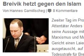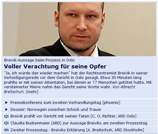 DIE ZEIT, das Leitmedium in Fragen journalistischer Ethik, vertritt in ihrer heutigen Online-Ausgabe die These: „Nur die Beschäftigung mit dem Furchtbaren führt zu Erkenntnis. Die Augen zu verschließen, macht blind.“ Stimmt. Aber deshalb müssen wir uns noch lange nicht von einem Monster namens Breivik durch journalistische Dauerberieselung zum Sprachrohr des Bösen instrumentalisieren lassen.