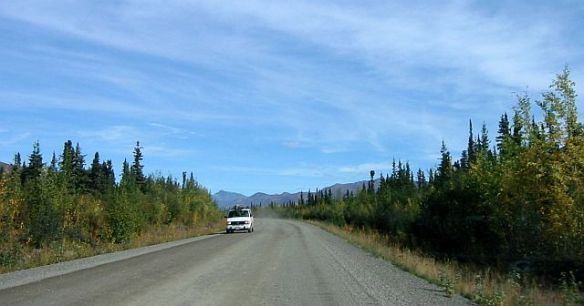 „Kies und Schotter prasseln unentwegt gegen Karosserie und Windschutzscheibe. Schon bald überzieht eine bräunliche Staubschicht Lenkrad und Armaturenbrett. Irgendwann geht das Hüsteln los. Jetzt eine Raststätte, eine Tasse Kaffee, ein Glas Wasser, das wär’s. Aber hier oben gibt es nichts dergleichen: Bis zur einzigen Tankstelle auf der 671 Kilometer langen Strecke sind es noch fünf Stunden. Zeit genug, um endlich mal wieder Radio zu hören. Oder Freunde auf dem Handy anzurufen. Aber nichts geht. Kein Signal. Der Dempster Highway ist die Straße ins Nirgendwo. Und nirgendwo ist der Autofahrer einsamer als auf dem Dempster Highway.