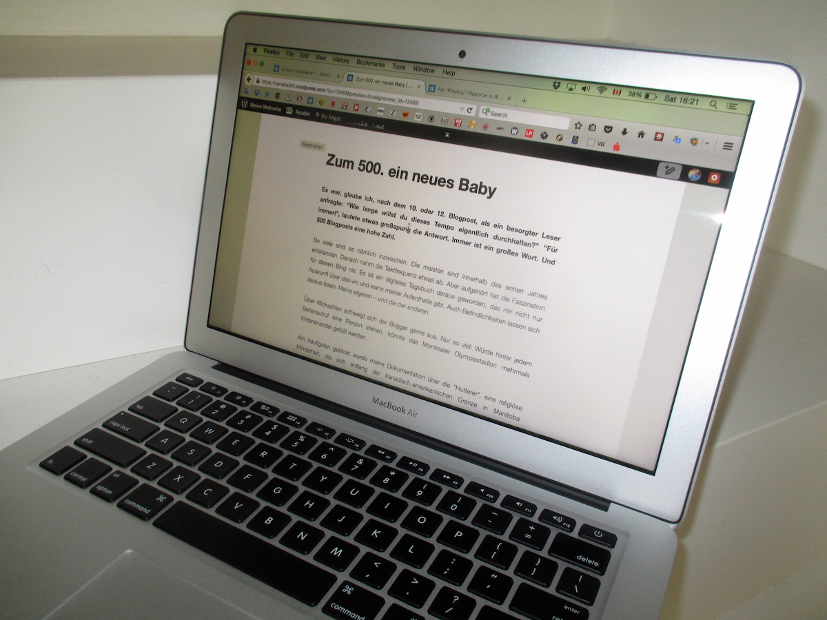 Mein Dankeschön für 500 Blogposts? Ein neues Baby. Diesen Beitrag tippe ich gerade in einen funkelnagelneuen MacBookAir. Ganz wie der Alte, nur mit mehr Power, mehr Stauraum und einem jungfräulichen Touchpad, das von keinem einzigen Kratzer getrübt wird.