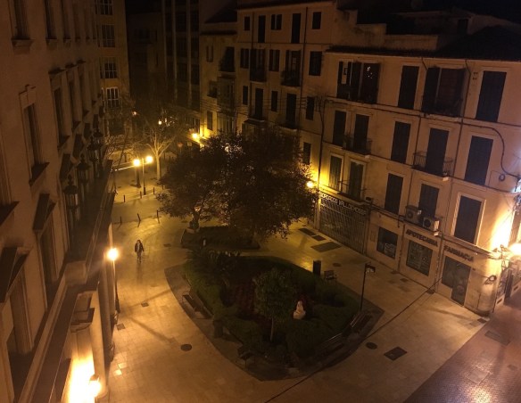 Halb sieben. Irgendjemand hat die Straßenbeleuchtung aus- und den Tag angeknipst. Die Sonne reibt sich hinter der typisch mallorquinischen Häuserfront im Osten der Plaza die Augen. Amseln huschen über den Platz und auch die Schritte der Fußgänger verhallen jetzt nicht mehr in der Häuserschlucht der Carrer San Miguel. Die Dezibelzahl dürfte inzwischen auf 75 angeschwollen sein. Mindestens.