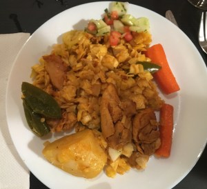 Die Speisekarte liest sich lecker. Jetzt meldet sich auch schon der 19-Uhr-Hunger. Gleich wird Julian eine herrliche Gemüsesuppe servieren, deren Namen ich vergessen habe. Und Meriem, die Vegetarierin, kredenzt ein Couscous ähnliches tunesisches Pasta-Gericht mit Gemüse, dazu selbst gebackenes Brot und Hühnchenbrust für die beiden Fleischesser am Tisch.