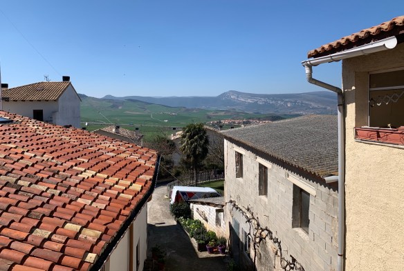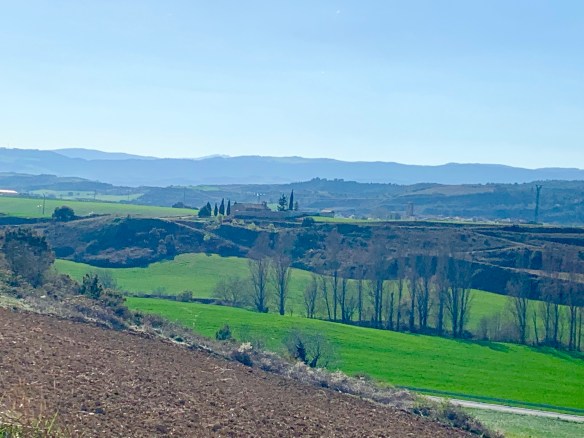 Kaum hatten wir dann die Stadtgrenzen von Pamplona hinter uns gelassen, tat sich uns eine wahrhaft begnadete Landschaft auf. Bergpanoramen in jeder Himmelsrichtung. Ganz weit im Nordosten sogar noch schneebedeckte Gipfel, in den Tälern dann hingehauchte Natur wie gemalt, so weit das Auge reicht.