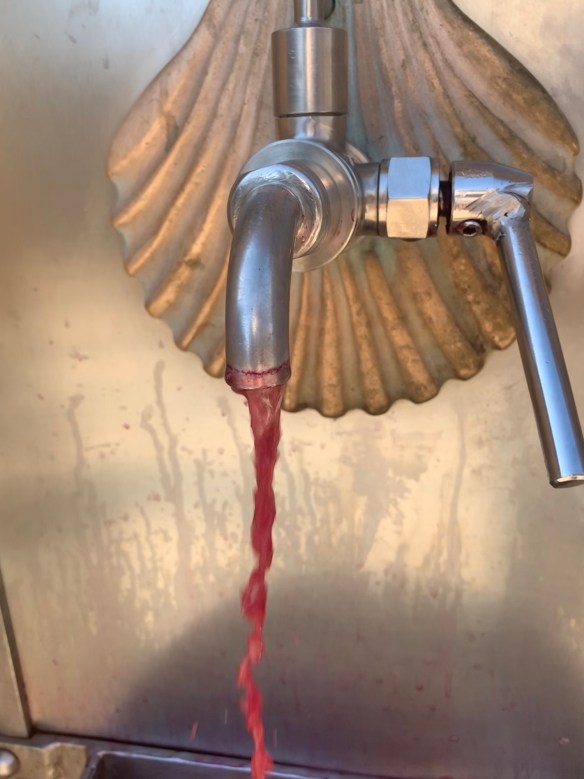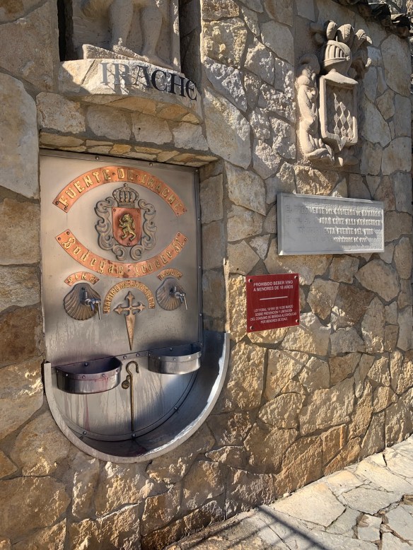 A propos Vino: Kurz hinter Estella, wo wir die letzte Nacht im Hostel verbracht haben und heute früh losgewandert sind, bietet eine Kellnerei Pilgern kostenlos und in unbegrenzten Mengen Rotwein an, der wie Wasser im Hahn aus der Wand fließt.