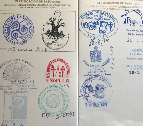 Es ist kurz nach 21 Uhr in dem richtig coolen, richtig preiswerten Privathostel, das wir eben noch auf den letzten Drücker gefunden haben. Die Stempel in unseren Pilgerpässen bilden langsam ein kleines, dokumentarisches Gesamtkunstwerk