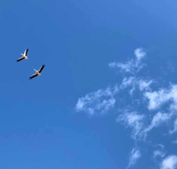 Aber wir haben es mal wieder gut erwischt. Ein gemütlicher Landgasthof am Ende des Dorfes, mit vorlauten Hähnen in Hörweite und drei Störchen, die über uns kreisen – perfekt für eine Auszeit und einen hoffentlich endlich mal guten Schlaf.