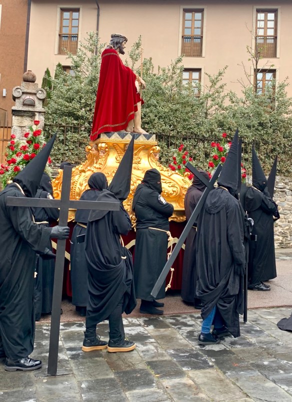 Auf dem Weg zum Camino ging es dann weiter. Durch die Altstadt von Ponferrada zogen die uns inzwischen bekannten Gilden in ihren Kutten und den Spitzhüten, die der Laie schon mal mit Kukluxclan-Mützen verwechseln kann.