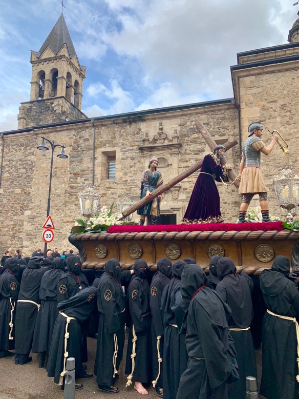 Eine Karfreitagsprozession erwartet uns auch gleich hier wieder, in Cacabelos, wo wir mangels Alternativen in der bisher bescheidensten Herberge abgestiegen sind. Will mal so sagen: In der Dusche habe ich eben vorsichtshalber Flipflops getragen.