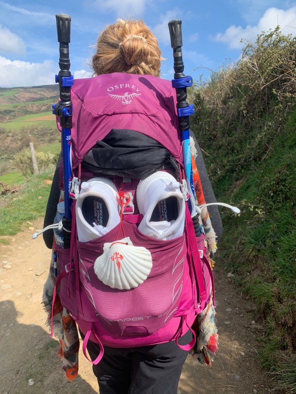Eine andere Frage ist jetzt schon ein paarmal gestellt worden: Blogleser wollten wissen, was eigentlich das Gebilde auf Lores Rucksack darstellt. Antwort: Nichts. Es ist nicht etwa eine Mickeymaus-Figur, die da an ihrem Rucksack hängt. Es sind Lores Turnschuhe, die in der Außentasche stecken. Darüber baumelt die Jakobsmuschel. (Siehe Foto unten). Ein spanischer Pilger gratulierte Lore heute am Vorbeilaufen zu diesem „magnífico“ Design.