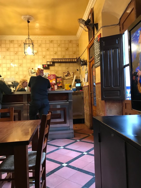 Die einzige Spanierin, die mir begegnet, ist eher rundlich und strohblond. Sie serviert den Frühstückstoast in der Bar. Frische Bocadillos hat sie keine. Ein Brötchen von gestern könne sie uns anbieten, mit einer Scheibe Käse drauf. Nehmen wir.