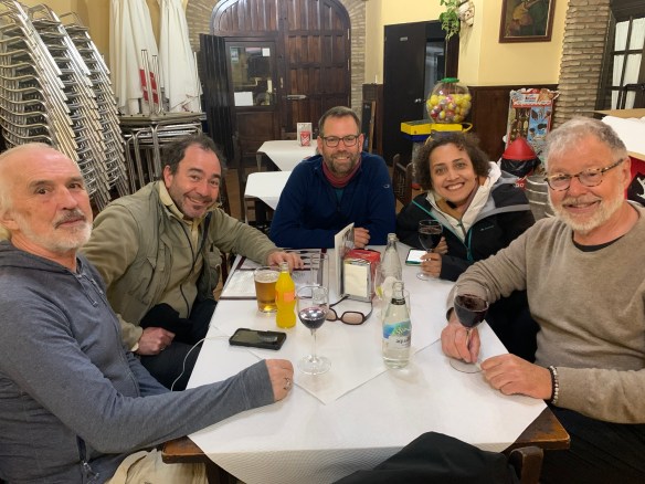 Später, am Ende der Tagesetappe in der Bar, treffen wir ihn wieder. Seine Tischnachbarin ist eine Pilgerin aus Brasilien. Sie schafft es gerade noch, sich vom Esstisch zu erheben. Dann verabschiedet sie sich mit einem müden Lächeln. Sie müsse sich hinlegen, sagt sie. Viel älter als dreißig ist sie nicht.