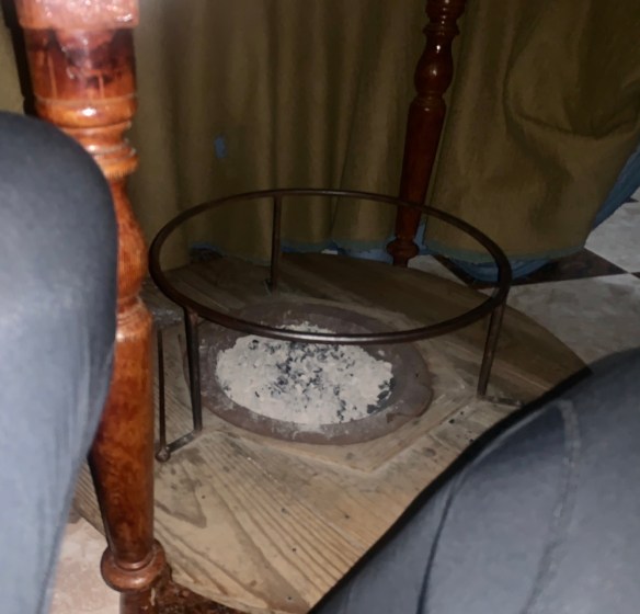 Unter dem Wohnzimmertisch, um den sich die Pilgergemeinde gesetzt hatte, glühte ein offenes Feuer. So blieben die Füße wohlig warm.
