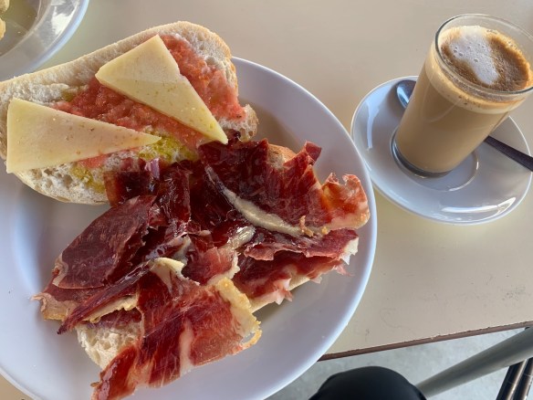 Und weil uns Stefans Schweinestory Appetit gemacht hat, haben wir uns eben beim lokalen Schinkenverkäufer am Stadtrand von Monestero auch gleich mit einem leckeren Iberico-Brötchen eingedeckt.