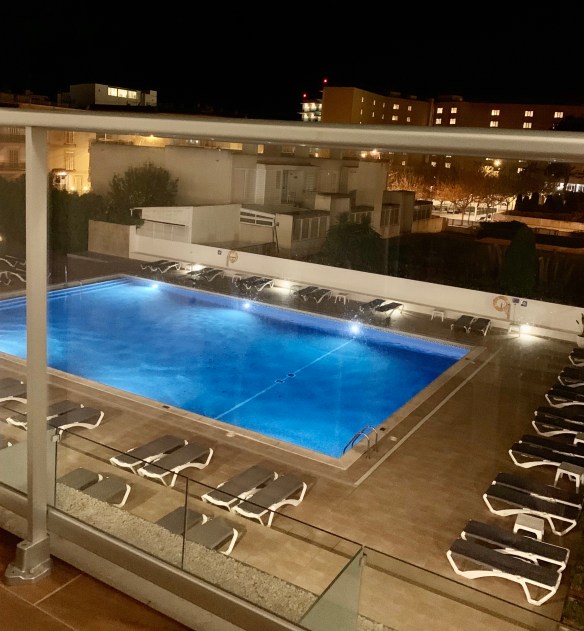 Unser Hotel ist schön. Wir sehen ein bisschen aufs Meer und ein wenig in die Berge. Unter unserem Balkon gibt es einen Swimmingpool und die Hotelbar ist lange geöffnet.