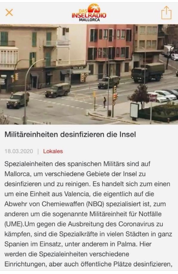 UNTEN: Gespenstische Aufnahmen auch aus Palma de Mallorca: dort ist jetzt das Militär im Einsatz, um Straßen und öffentliche Gebäude zu desinfizieren.(Quelle: Inselradio)