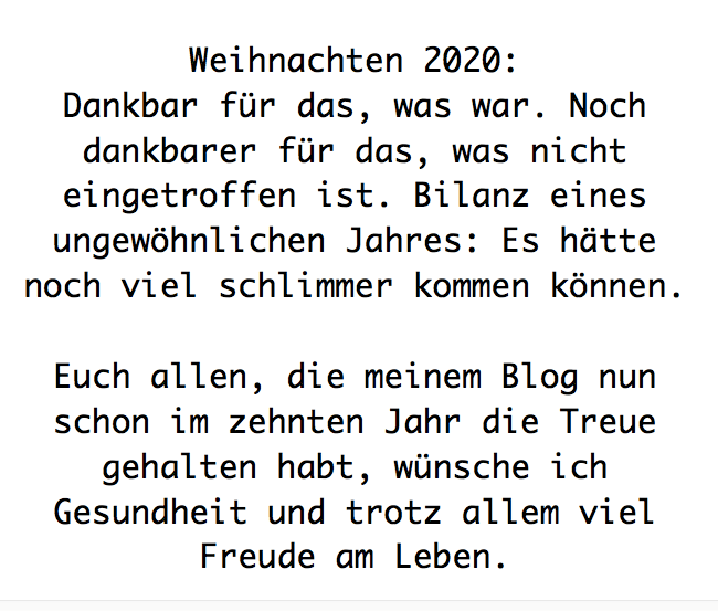 Allen Bopps herzliche Weihnachtsgrüße aus dem Oberland. Möge das Jahr 2021 für Euch ein besseres Jahr werden, als das Heurige. Obwohl: Das könnten wirklich die Meisten von uns gebrauchen. Du lieber HeBo aber besonders. Mögen Deine Augen Dir wieder die Möglichkeit geben, uneingeschränkt zu lesen, zu handeln und vor allem: Noch einmal den Camino heraus zu fordern und Deine Blogleser in Wort und Bild so daran teilhaben zu lassen, als ob man mit Euch gewandert wäre. Ich möchte dieses Jahr mit einem Spruch aus Friedrich Torbergs „Tante Jolesch“ schließen: „Was noch a Glück ist…..“ Herzliche Grüße Uli