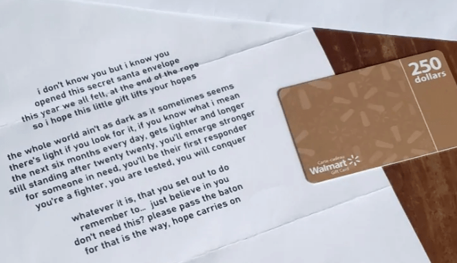 Als sie Heiligabend vor ihrer Haustür einen weissen Umschlag mit der Aufschrift „Secret Santa“ vorfand, dachte sie zunächst an eine Postwurfsendung, wie man sie in der Weihnachtszeit ja öfter mal ungefragt bekommt. Dann öffnete sie den Brief und fand ein in Kleinbuchstaben getipptes Gedicht vor. Und einen 250-Dollar-Geschenkgutschein von Walmart.