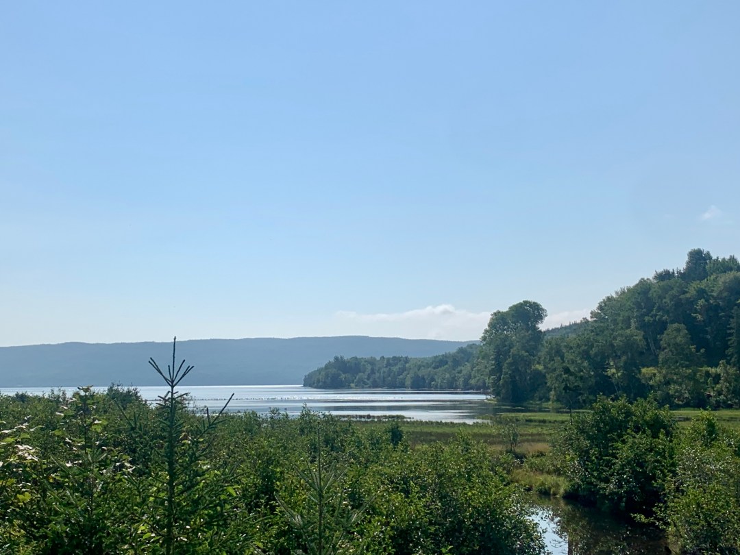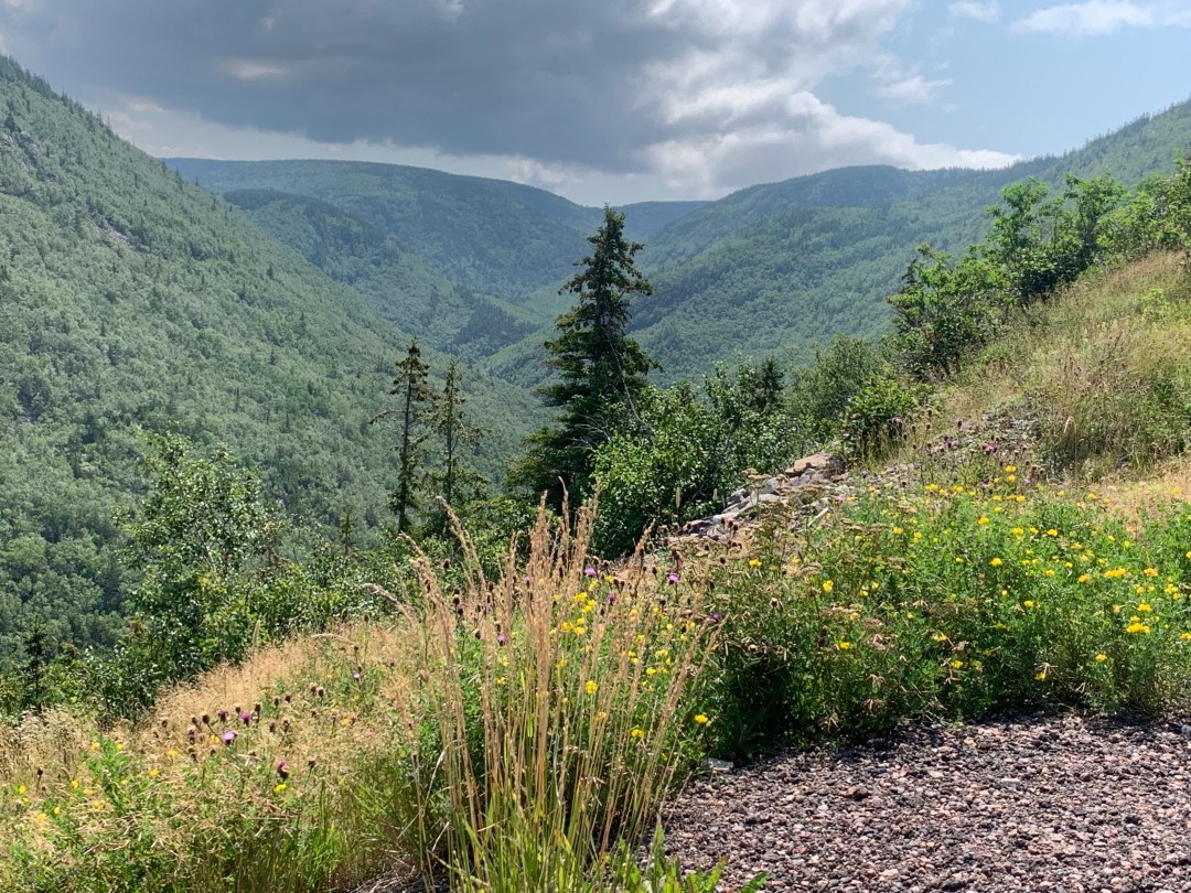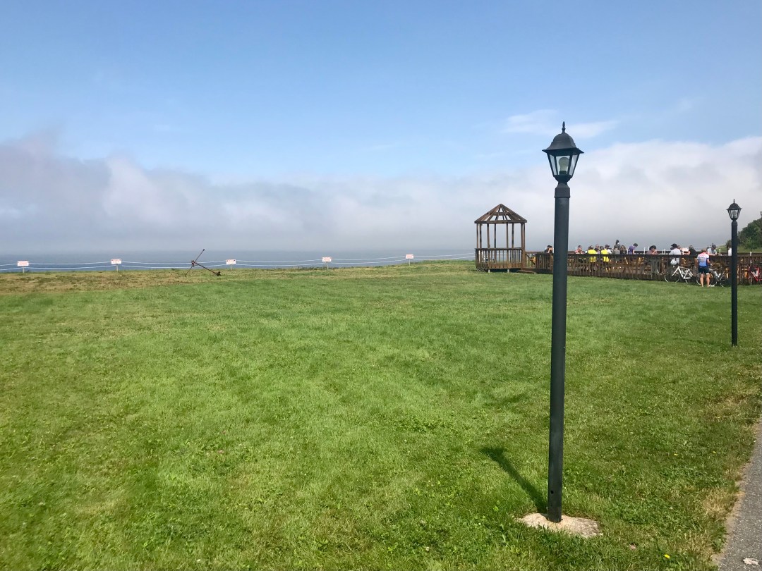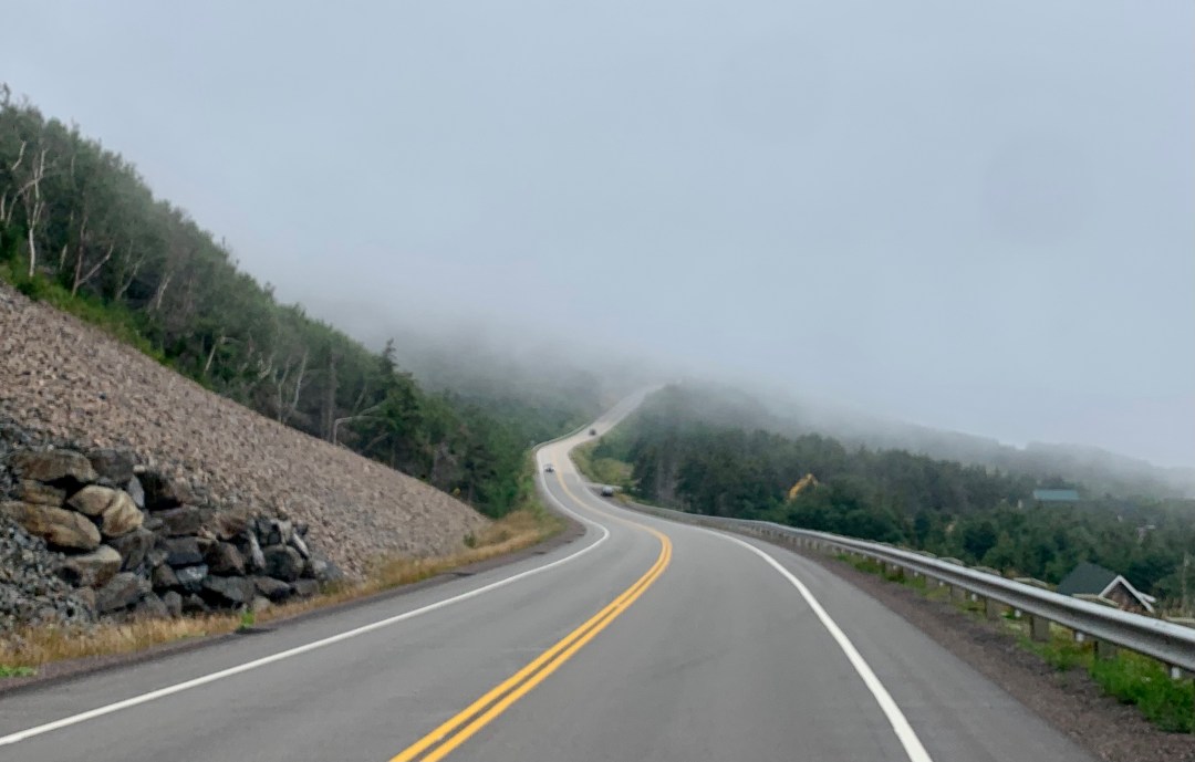 So ganz nebenbei spielte die Natur heute den ganzen Tag über noch Kulissenschieber in diesem Theater, das sich Cape Breton nennt. Mal bekamen die Gipfel der Berge Wolkenhütchen aufgesetzt, mal traute sich der Nebel bis runter ins Tal. Wenn aber dann die Sonne schien, was sie fast den ganzen Tag tat, dann brannte sie sich fast unbarmherzig ins Schiebedach.