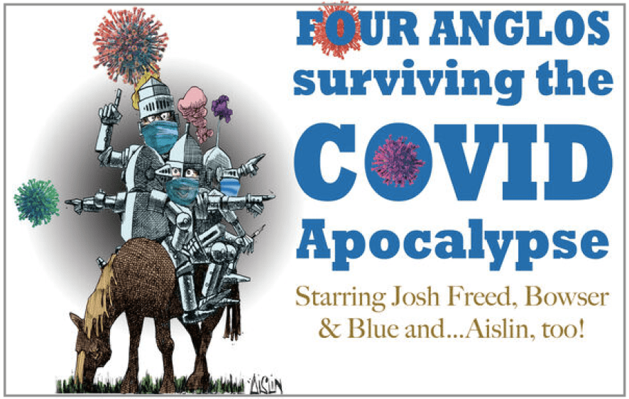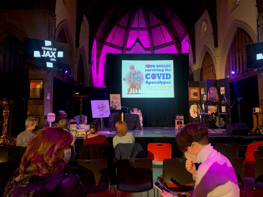 “FOUR ANGLOS SURVIVING THE COVID APOCALYPSE” heisst die Show, die jetzt schon seit Wochen durch Montreal und das benachbarte Umland geistert. Gestaltet wird sie von vier Künstlern, die in englischsprachigen Kreisen meiner Stadt seit Jahrzehnten zum Inventar gehören:
