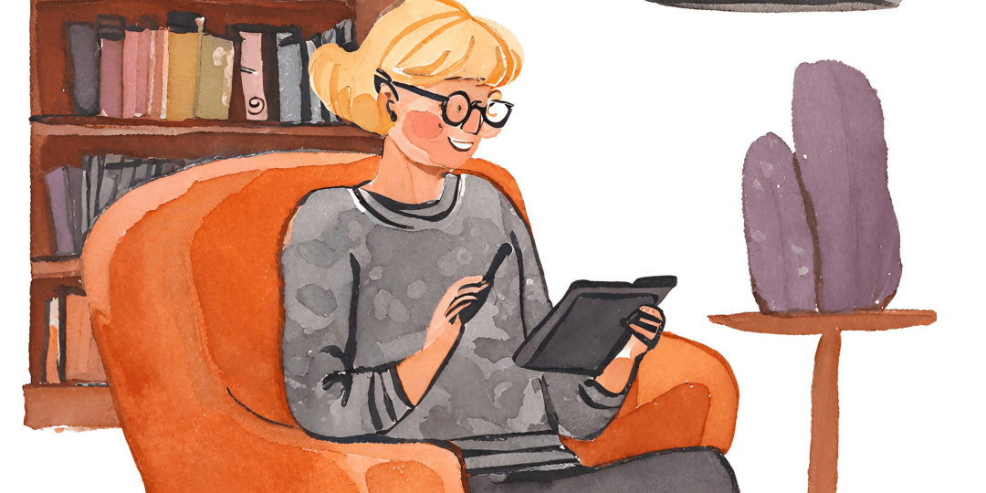 Lesende Lore: Auch dieses Bild wurde nach meinen Anweisungen mit Künstlicher Intelligenz geschaffen. Mein Anforderungstext lautete: „Freundliche ältere Frau, blond mit dunkler Brille, sitzt auf einem orangenen Designer-Sessel und liest in ihrem iPad. Im Hintergrund viele Bücher.“ Den Rest hat KI kreiert.