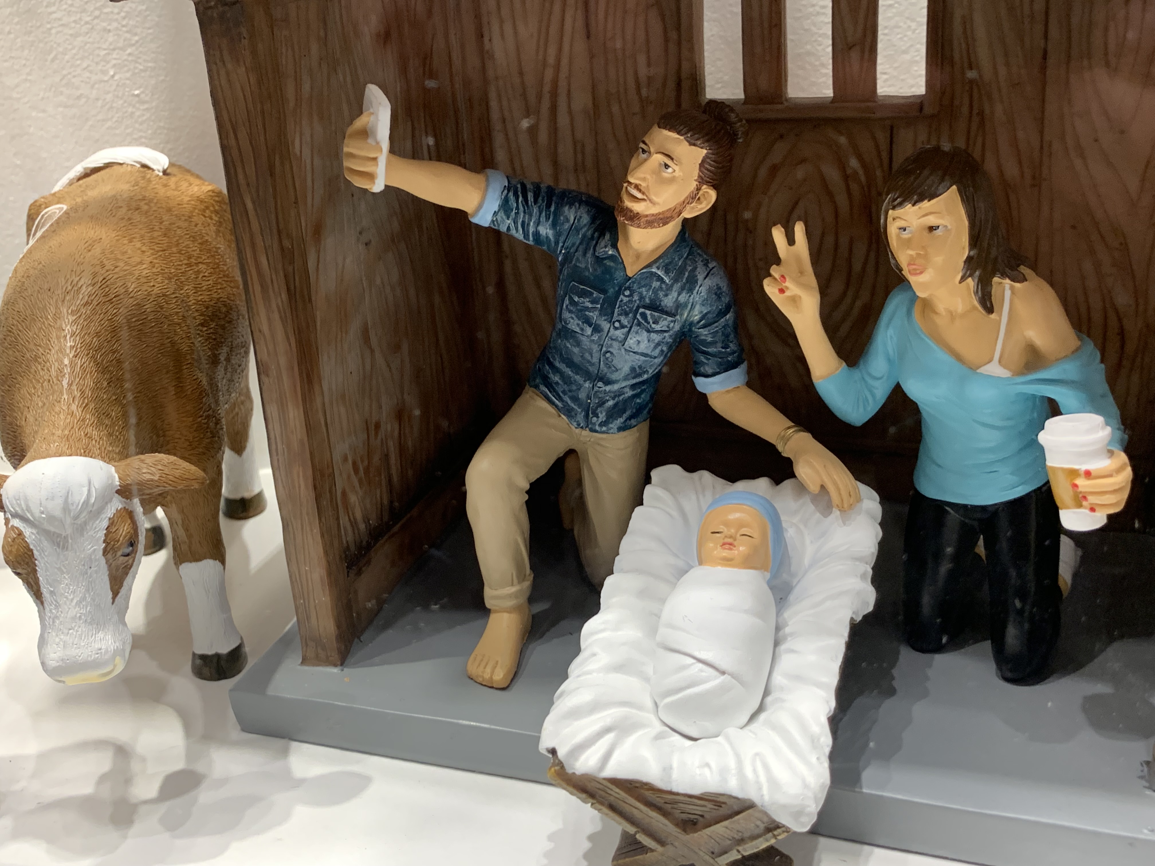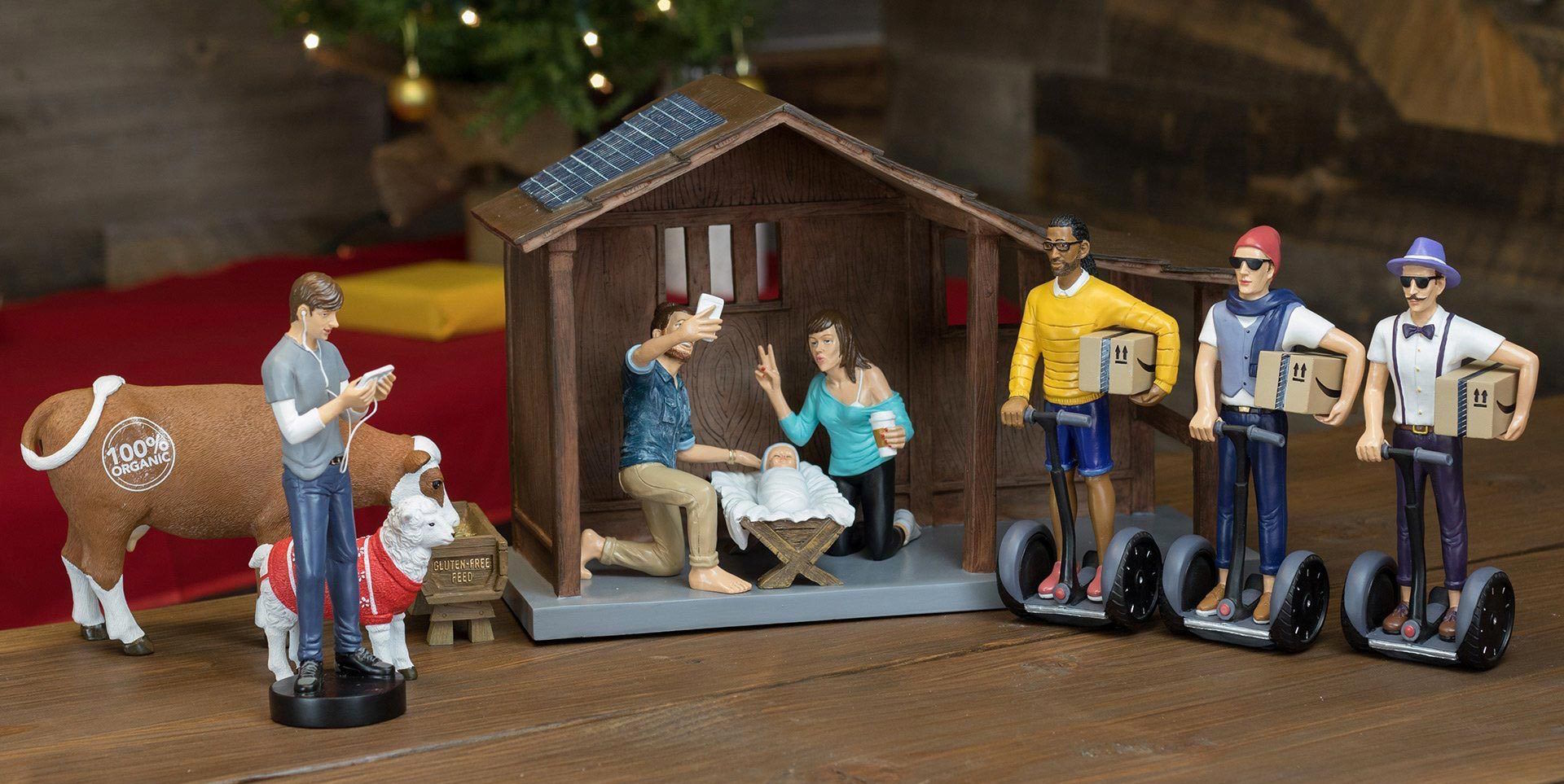 Josef zückt das Handy zum Selfie. Maria formt das Victory-Zeichen. Die Heiligen Drei Könige beliefern das Jesuskindlein mit Amazon-Paketen auf dem Segway. Willkommen in der Montrealer Hipster-Krippe!