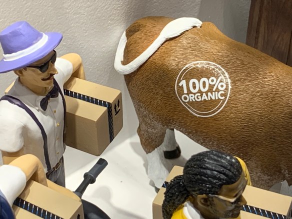 Und jetzt eben ein Stall mit Photovoltaik-Dach, eine Maria mit einem Becher Starbucks-Kaffee in der Hand und einem Schaf, das glutenfreies Heu frisst. Versteht sich von selbst, dass die Kuh biofreundlich aufgewachsen ist.