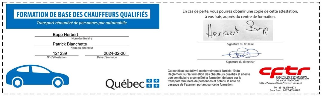 Fünfzehn Stunden Unterricht (en français, wir sind schließlich in Québec) habe ich hinter mir: Mechanik, Rechts-, Versicherungs- und Verkehrsfragen, Kundenservice, Umgang mit Menschen mit eingeschränkter Mobilität und weitere spannende Aspekte.