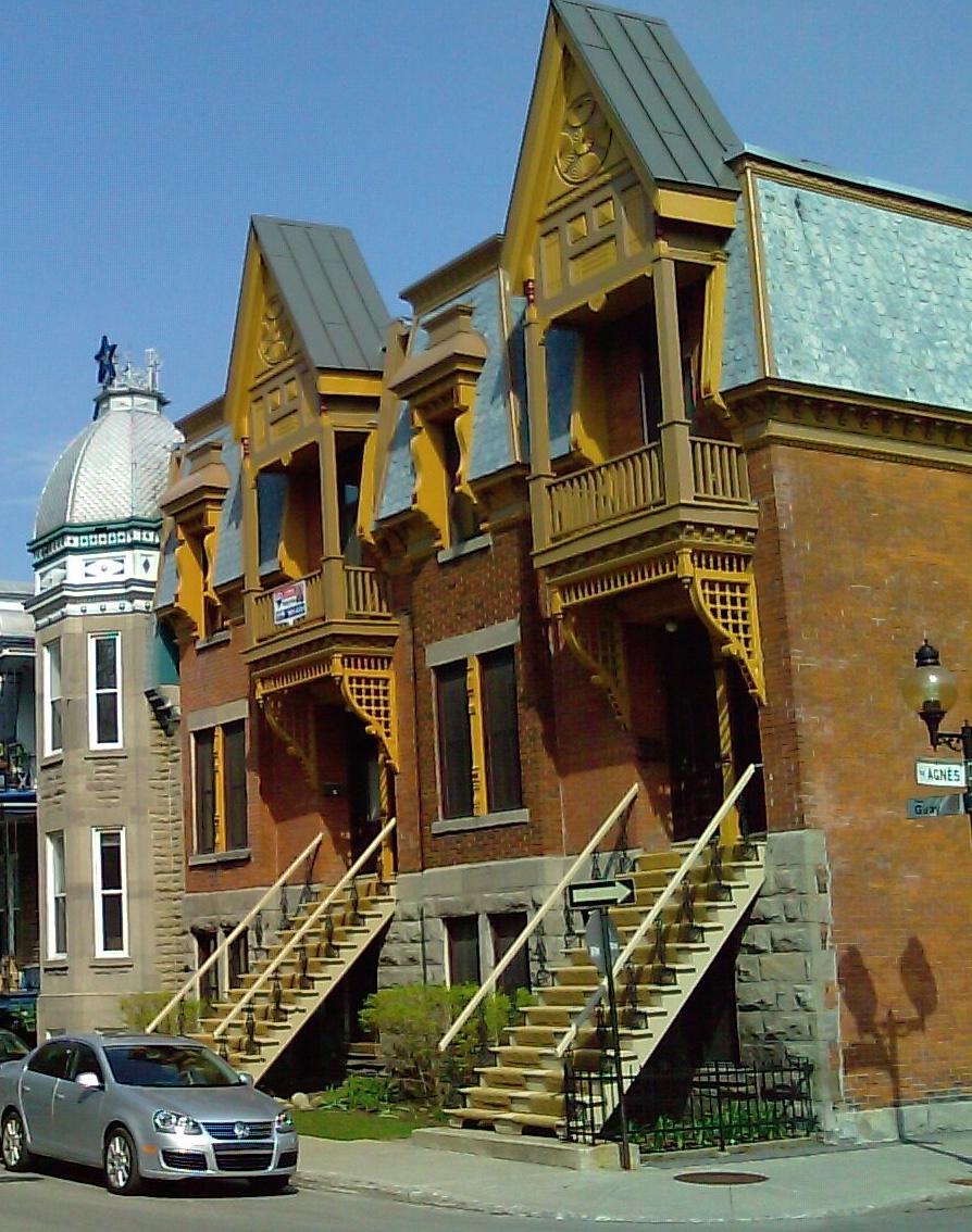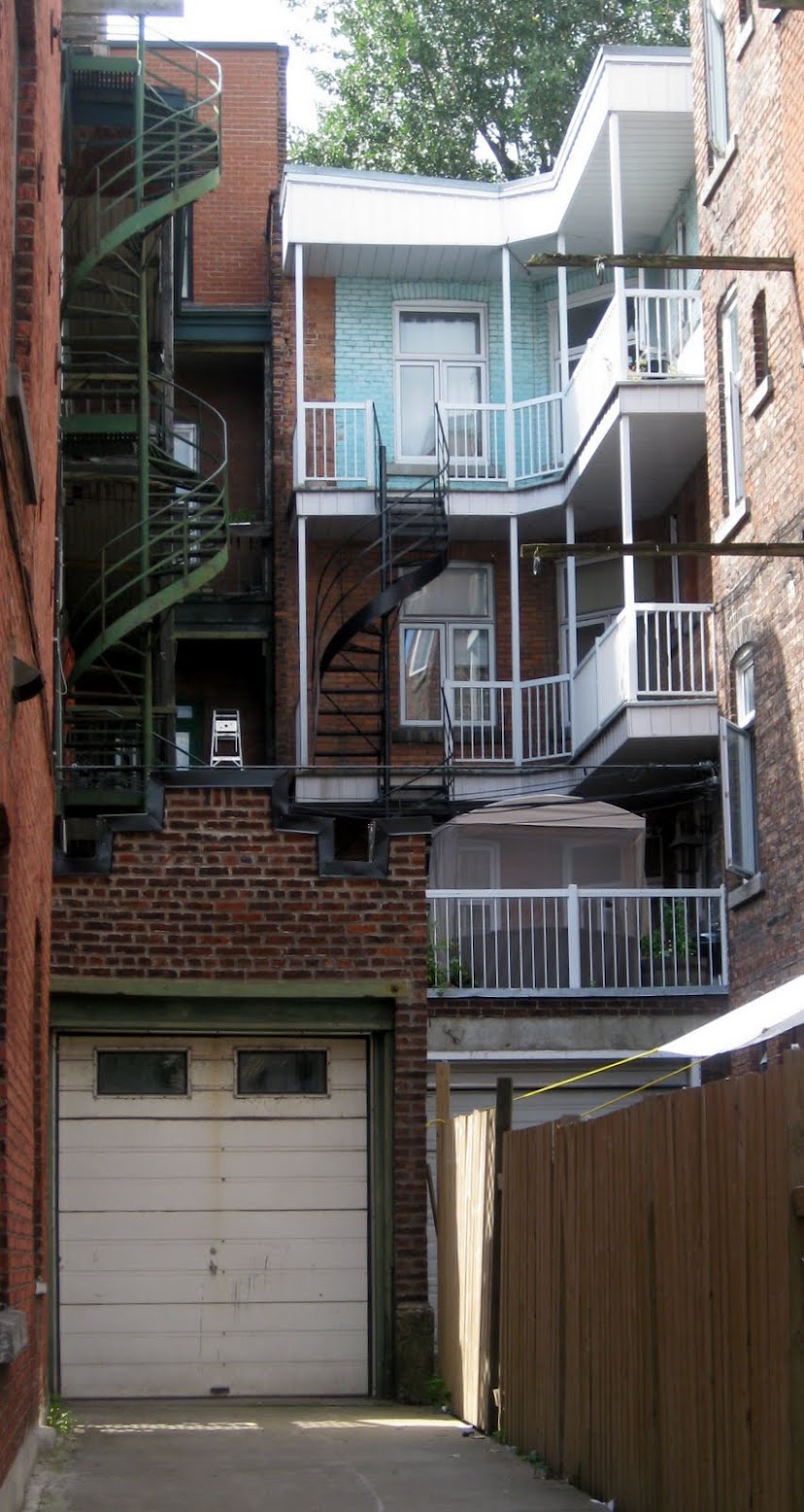 So wird gemunkelt, dass im letzten Jahrhundert, als in der Provinz Quebec die katholische Kirche noch das Sagen hatte, Außentreppen lieber gesehen wurden als dunkle Treppenhäuser. Man weiß ja nie, was sich dort im schummrigen Licht so alles abgespielt haben könnte.