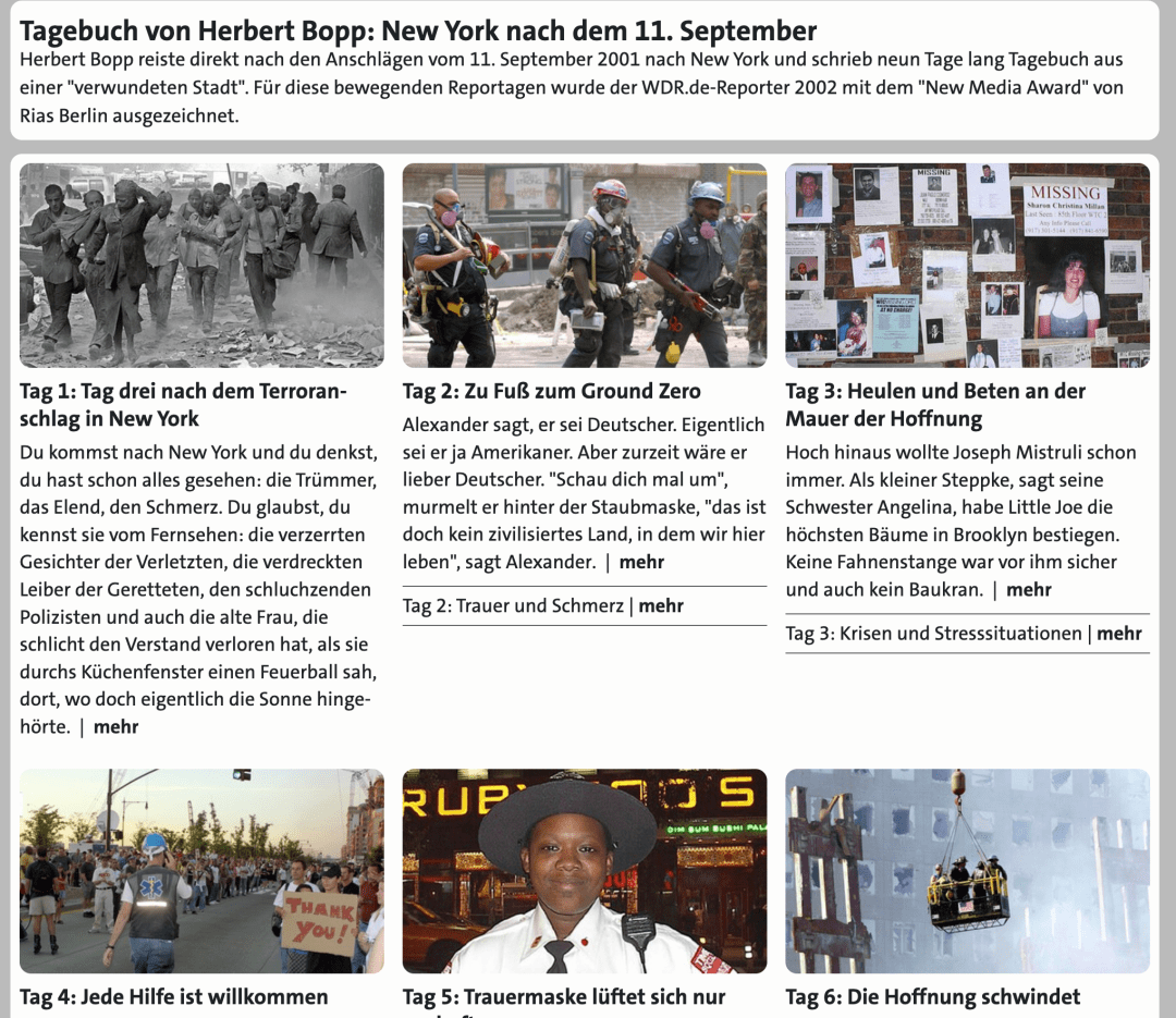 Jedes Mal am 11. September bekomme ich Gänsehaut. Das geht jetzt schon seit 23 Jahren so. Ich erinnere mich dann, wie ich mit der Bahn von Montreal nach New York City fuhr, um fast zwei Wochen über eine verwundete Stadt zu berichten. Aus gegebenem Anlass finden Sie heute noch einmal die gesammelten Reportagen, die ich damals für WDR.de geschrieben habe.