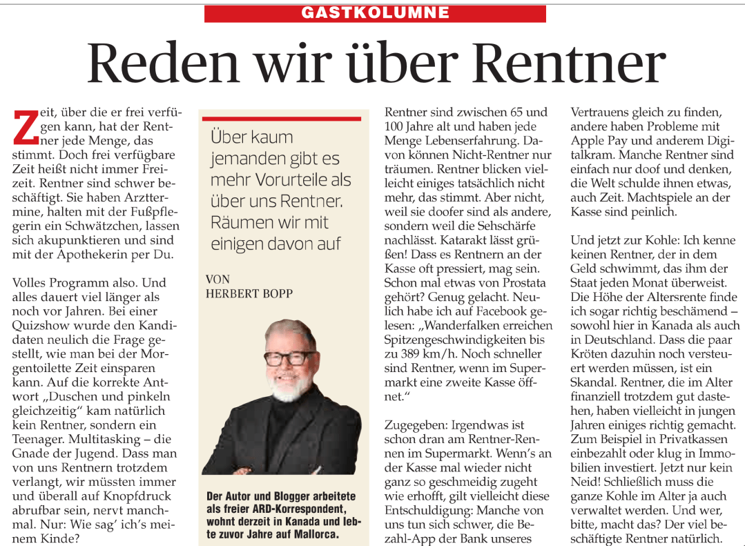 Das ist ja mal eine Überraschung! Ein Beitrag über Rentner im Mallorca Magazin. Ich hoffe, du bekommst auch Geld dafür, dass du deine spärliche Zeit aufbringen musstest. Es stimmt offensichtlich, was ich öfter schon vernommen hatte – Mallorca ist keine Putzfraueninsel mehr, sie ist das Rentnerparadies. Katarakt, Prostata, Digitaldefizite, all das trifft gewiss zu und lässt sich als Begründung heranziehen für Verhaltensauffälligkeiten der Rentner. Allerdings weiß ich nicht sicher, ob das mit der Erfahrung immer so seine Berechtigung hat.