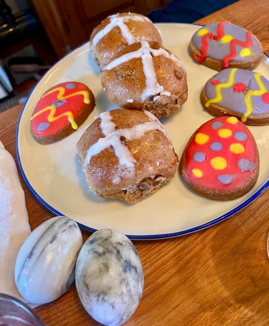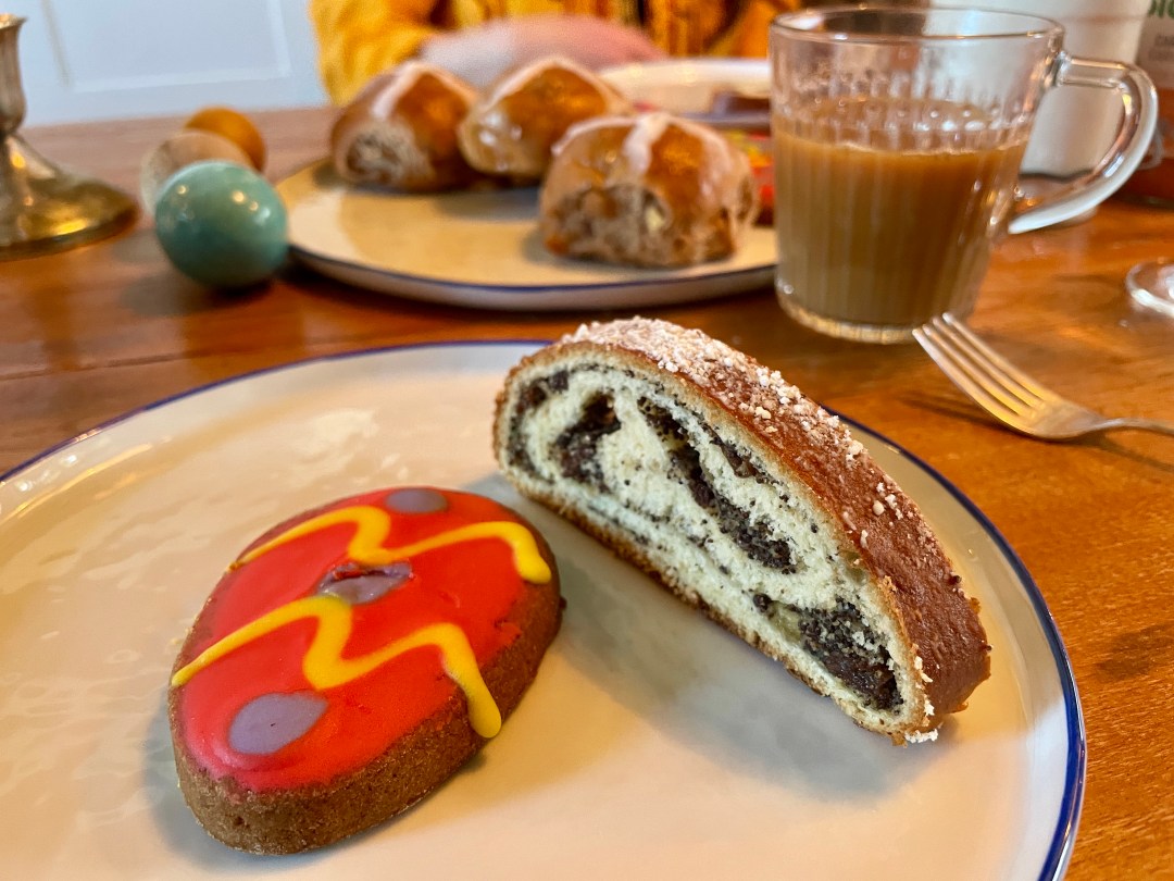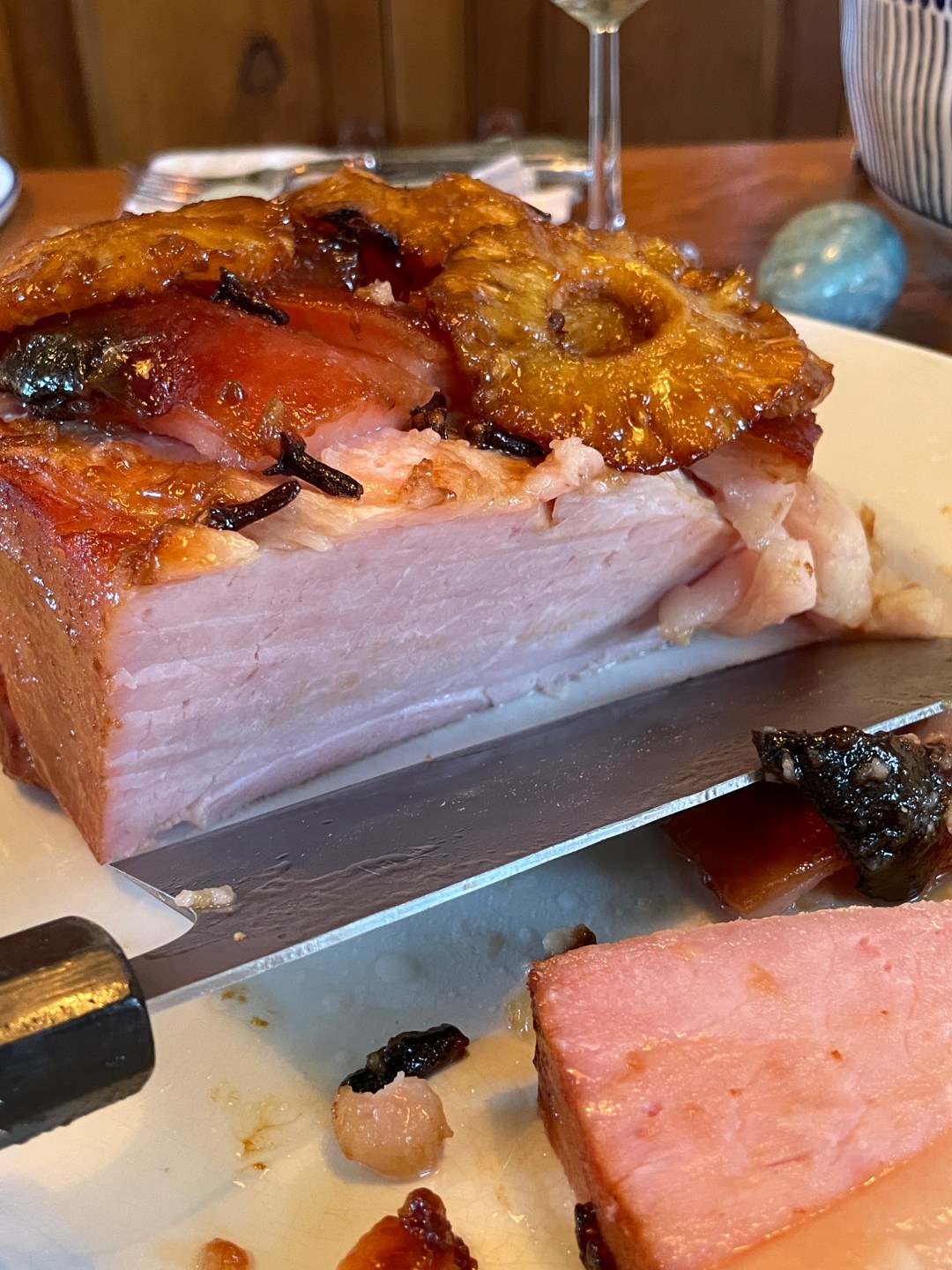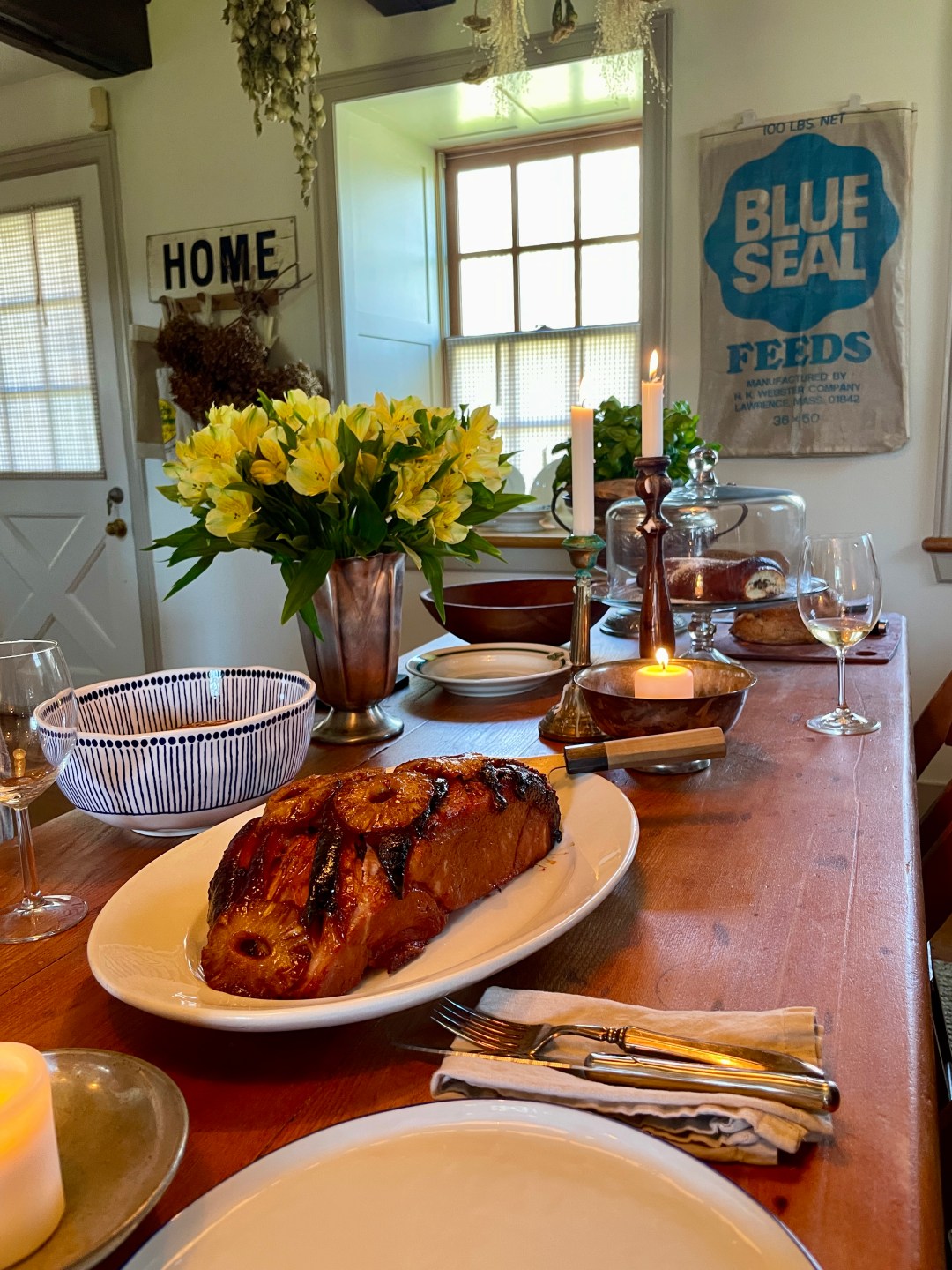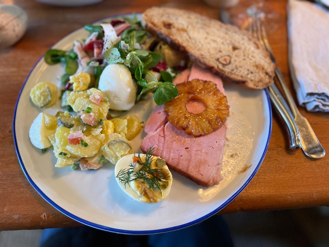 Für’s Hauptgericht ist der Hausherr verantwortlich. Cassians Ofenschinken mit kandierten Ananasscheiben ist bei uns längst Tradition. Dazu gibt’s Lores kreativen Kartoffelsalat, Matts gefüllte „Deviled Eggs“ und Julias Gemüseensemble aus marktfrischen Zutaten. Als Nachtisch werden handverzierte Cookies und Mohnkuchen aus der Stadt serviert.