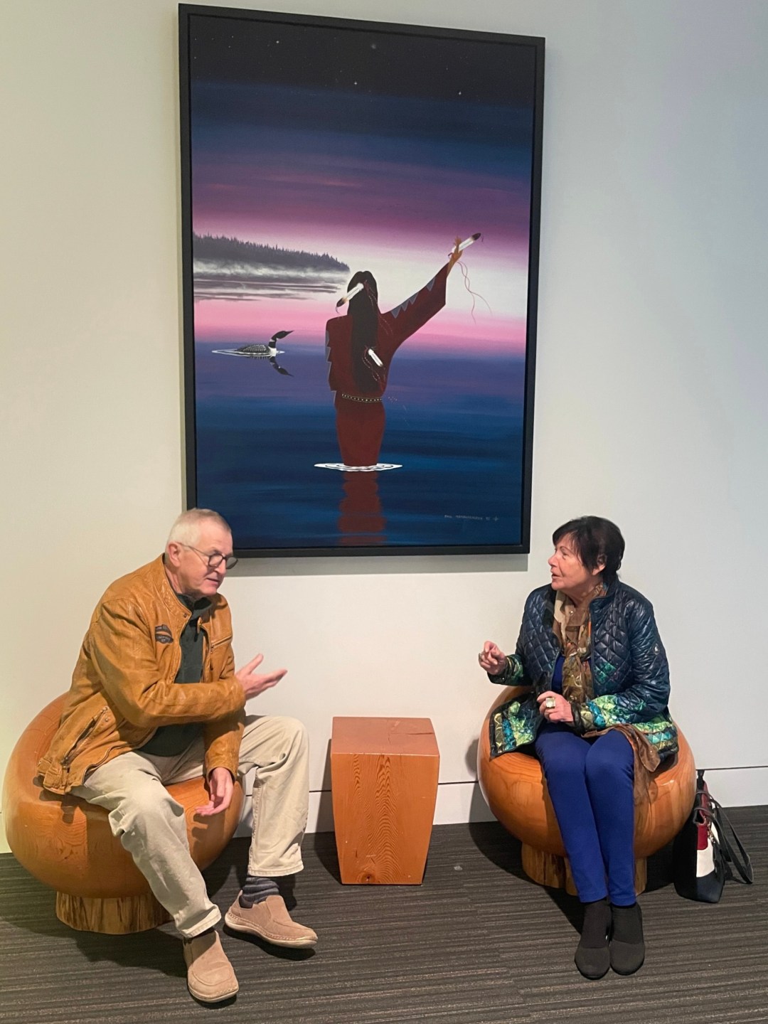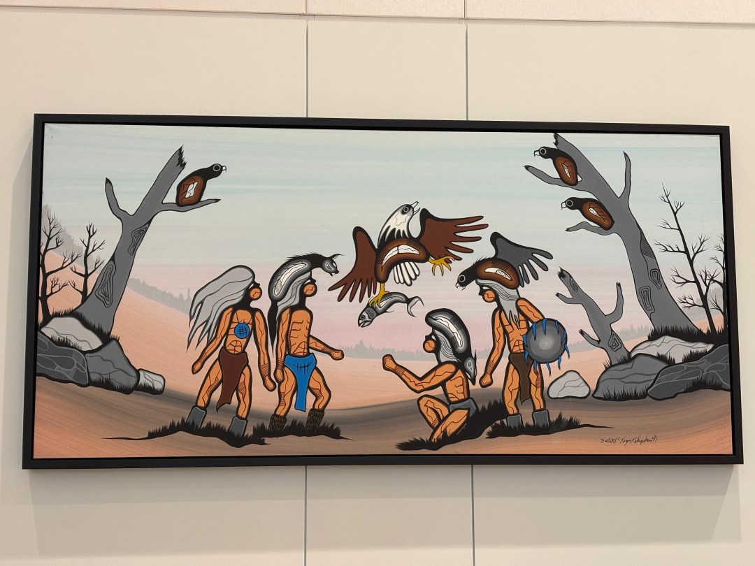 Im Herzen des Convention Centre läuft eine Dauerausstellung mit indigener Kunst – gespendet von unserer Freundin Christa, bei der wir zurzeit zu Gast sind. Jedes Gemälde, jeder Stich, jede Schnitzerei hat eine Geschichte. Christa kennt diese Geschichten, wir durften sie heute erfahren.