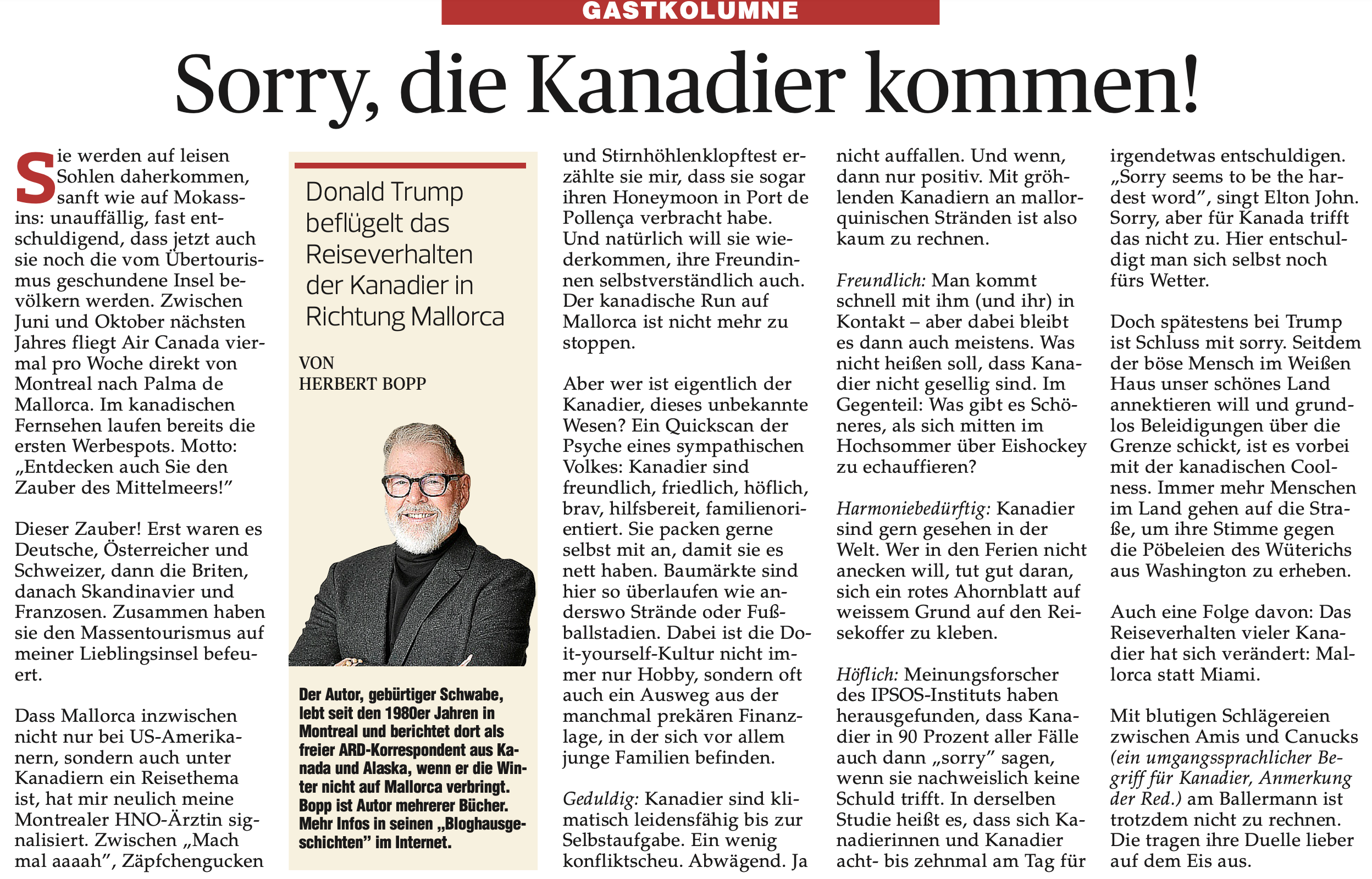 Nein, wir kommen nicht nach Mallorca, aber vermutlich Tausende Kanadier, die vom kommenden Jahr an von den Direktflügen zwischen Montreal und Palma profitieren werden. Und auf wen genau müssen sich die Mallorquiner da einstellen? Das Mallorca Magazin bat mich zu diesem Thema um einen Gastkommentar. (Zum Vergrößern bitte anklicken!)