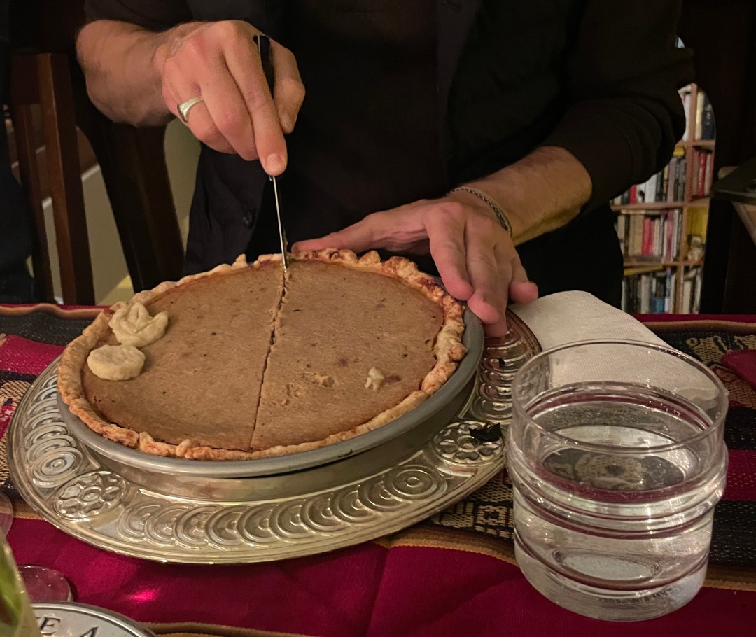 Das Essen selbst läuft immer nach demselben Muster ab: Vorspeisen, gefüllter Turkey, Kartoffelpüree und Squash, ein kürbisähnliches Gemüse. Dazu Cranberries und peruanischer Spargel. Für die Nachspeise sorgte dieses Mal Cassian: Kürbiskuchen, stilecht aus dem Backofen seiner Farm, frisch auf den Tisch in der großen Stadt.