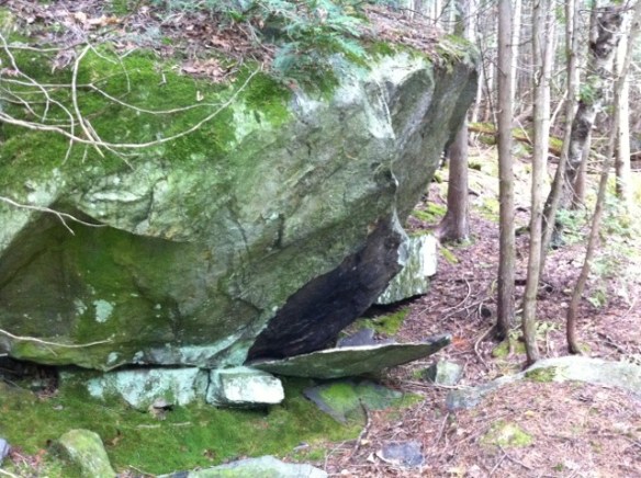 Kommen wir also zur eigentlichen Gefahr, die zurzeit am Lac Dufresne lauert. Zum Felsen. Dieser Gesteinsbrocken ist so groß wie ein VW-Golf und steht direkt oberhalb unserer Cottage in Schräglage. Seit etwa zwei Milliarden Jahren. Der Fels gehört zum Canadian Shield und ist damit Teil der weltweit ältesten Gesteinsformation. Vermutlich hat er schon Indianderschlachten und Eiszeiten hinter sich, Geröll-Lawinen, Vulkanausbrüche und auch den einen oder anderen Tsunami – keine Ahnung. Jedenfalls hat sich jetzt eine fette Scheibe vom Fels gelöst, einfach so. Abgesplittert ohne Fremdeinwirkung. Blechschaden am Stein.