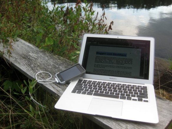 „Tethering“ ist eine feine Sache. Du sitzt irgendwo im Café, am Strand oder, wie ich im Moment, in der Blockhütte am Lac Dufresne und kommunizierst per Internet mit der Welt da draußen. Beim Tethering (to tether = anbinden) wird der Laptop ans Handy angeschlossen. Das Mobiltelefon übernimmt dann – drahtlos per Bluetooth, oder aber über eine Kabelverbindung – die Funktion des Modems.