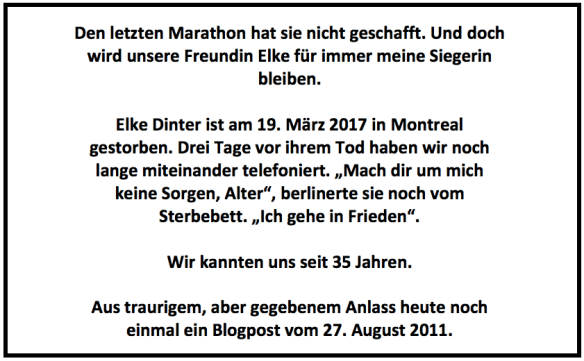 Manchmal werden einem Menschen ins Leben gespült, vor denen man einfach nur den Hut ziehen muss. So einfach ist das. Elke Dinter aus Montréal gehört auch zu denen. Obwohl sie vom Schicksal ziemlich gebeutelt wurde, ist sie die Stehauffrau in unserem Freundeskreis. An diesem Wochenende wächst sie wieder über sich hinaus.