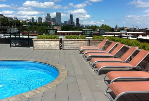 Schön ist es hier oben. Ein Gemeinschafts-Penthouse mit Billardtisch, Fernsehzimmer und einem Kamin für den kalten kanadischen Winter. Für den Sommer ein Schwimmbad mit coolen Liegestühlen, die einem die Sicht über downtown Montreal freigeben. Daneben Oleander, Hibiskus und andere exotische Blumen – die perfekte location für einen Photoshoot. Deshalb gewittert es manchmal auf unserer Dachterrasse.
